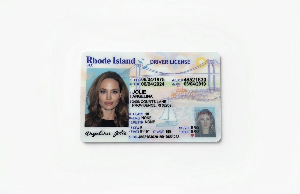 - Realistic Design: Mimics actual Rhode Island state IDs, including the anchor seal, “Hope” motto, wave motifs, blue/gold palette, and REAL ID-compliant elements, for seamless acceptance.
