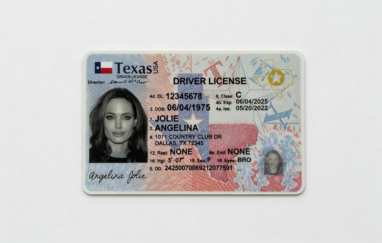 Our Texas IDs are equipped with advanced security features, such as intricate holograms (with tilt effects revealing the Lone Star and state outline), precise microprinting, UV fluorescent elements that reveal hidden patterns including the state flag, longhorn motifs, and repeating “TEXAS” text, laser perforations, ghost images, tactile raised text, optically variable ink that shifts colors, multiple laser-engraved elements, and embedded security threads. These enhancements not only elevate the overall design but also make our IDs one of the hardest to fake available on the market. For those who prioritize security and quality, our Texas IDs offer exceptional peace of mind.